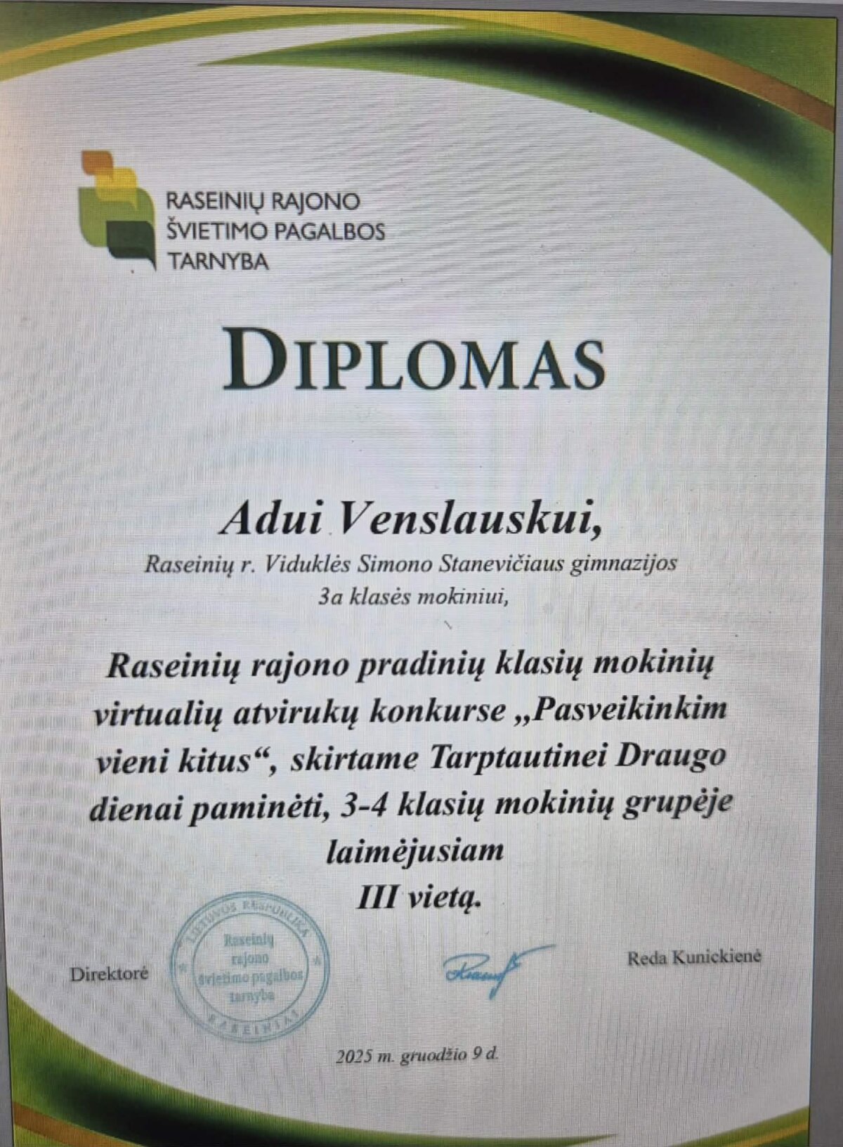 Lapkričio pabaigoje vyko Raseinių rajono pradinių klasių mokinių virtualių atvirukų konkursas „Pasveikinkim vieni kitus“, skirto Draugo dienai paminėti. Jame dalyvavo ir mūsų gimnazijos mokinių sukurti atvirukai. 3-4 klasių mokinių grupėje III vietą laimėjo 3a klasės mokinys Adas Venslauskas. Mokinys savo darbelį sukūrė ir suprogramavo Scratch aplinkoje.