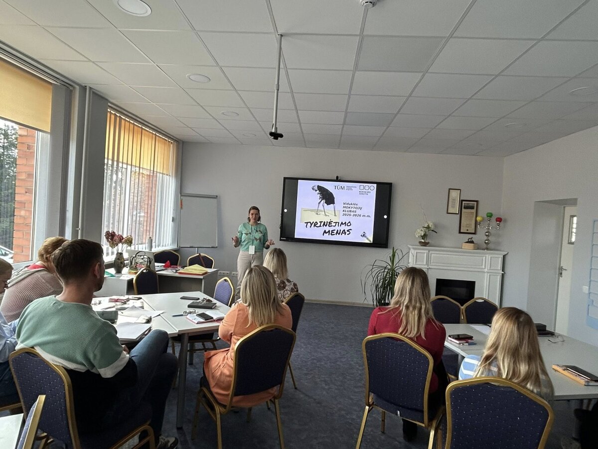 Spalio 22d. gimnazijoje pradėjo vykdyti veiklas programos ,,Tyrinėjimo menas: kultūrinis ugdymas 2025-2026” projekto ,,Mokytojų klubas” komanda. Mokytojams veiklą (pirmą planavimo sesiją) vedė aktorė, teatro pedagogė, gydytoja - klounė iš Klaipėdos Karolina Kuzborska Urbonė.