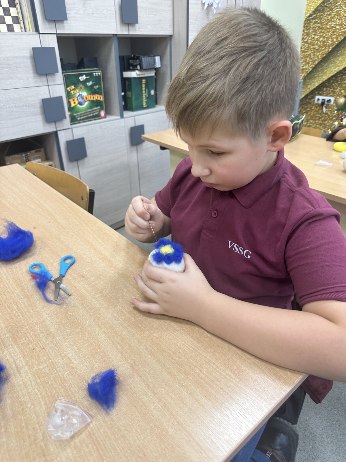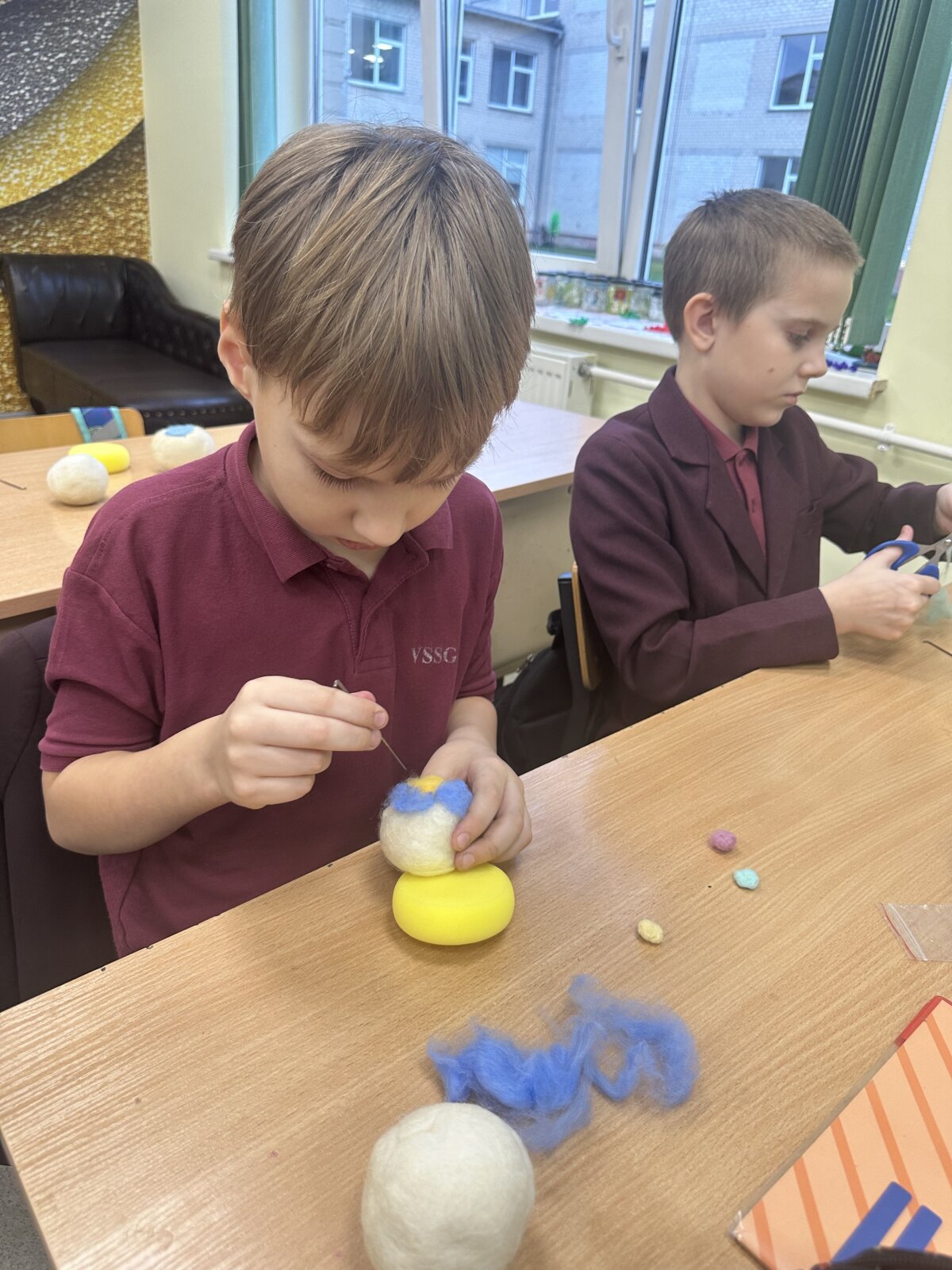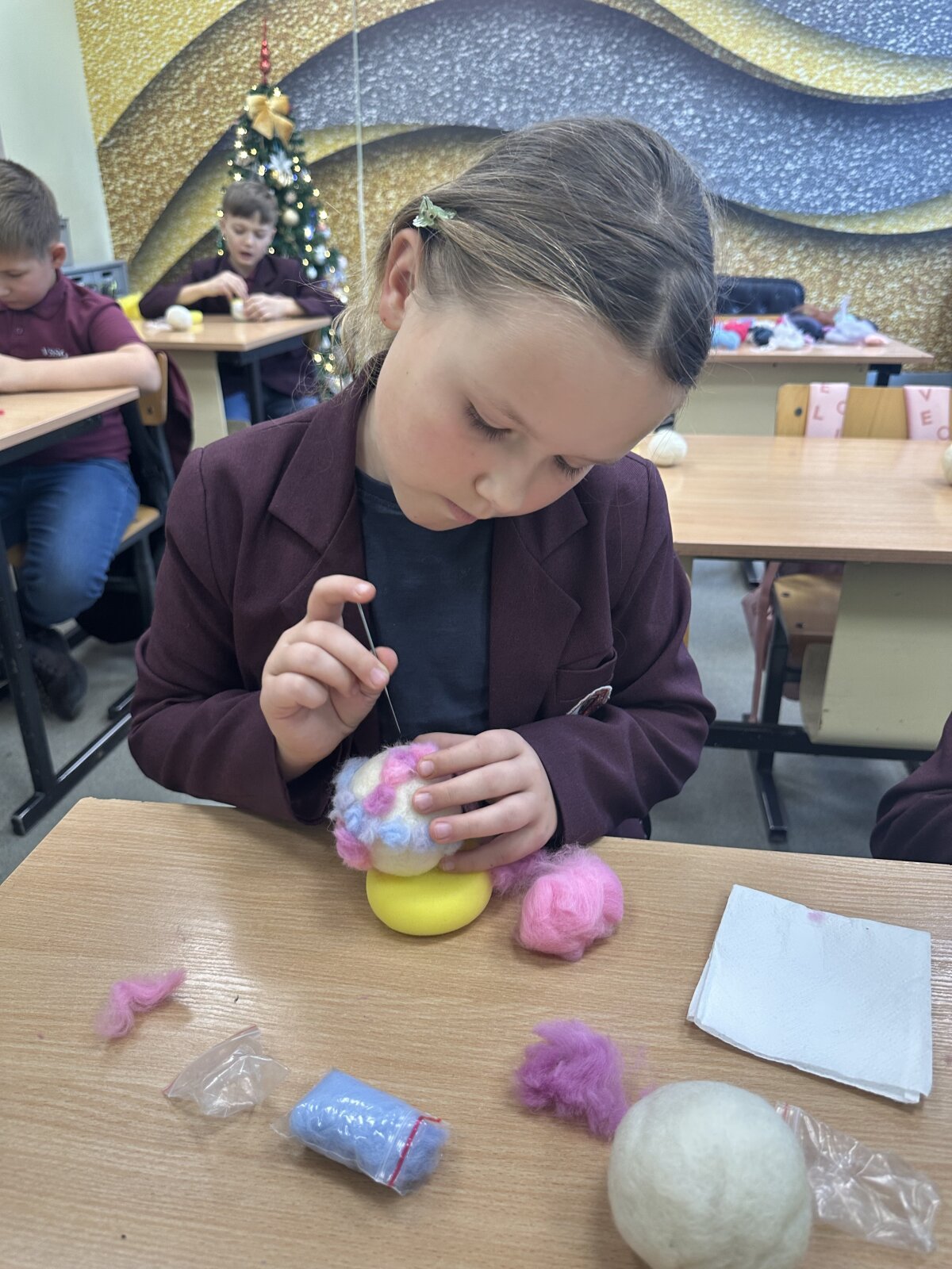 3b klasės mokiniai technologijų pamokų metu mokėsi vilnos vėlimo technikos. Šlapiuoju būdu mokiniai suvėlė vilnos kamuoliukus, kuriuos dekoravo veldami sausą vilną su adatėle. Mokiniai sukūrė išskirtinius eglutės žaisliukus. Šio užsiėmimo metu kartu su mokiniais kūrybiškai ir prasmingai leidome laiką, mokydamiesi vilnos vėlimo. Praktinių veiklų metu mokiniai susipažino su natūralios vilnos savybėmis, vėlimo technikomis bei saugaus darbo principais.